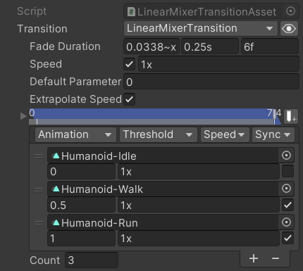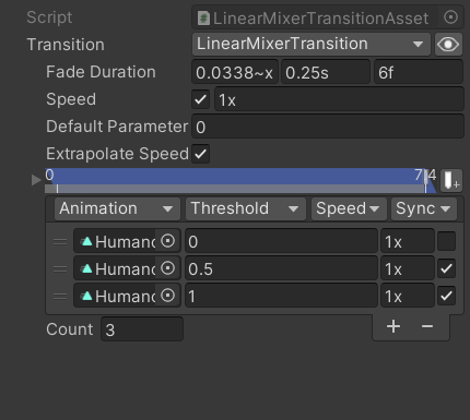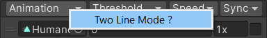 Added a Two Line Mode toggle function in the Animation heading of Mixer Transitions which shows each animation on a separate line from its threshold/speed/sync since the animation names are often cut off by the limited space.