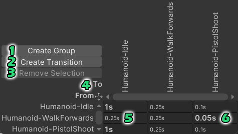 0.05where the Walk row intersects the Shoot column indicates that it has a modified value. - So if the character was playing Walk and is told to Shoot, it will take
